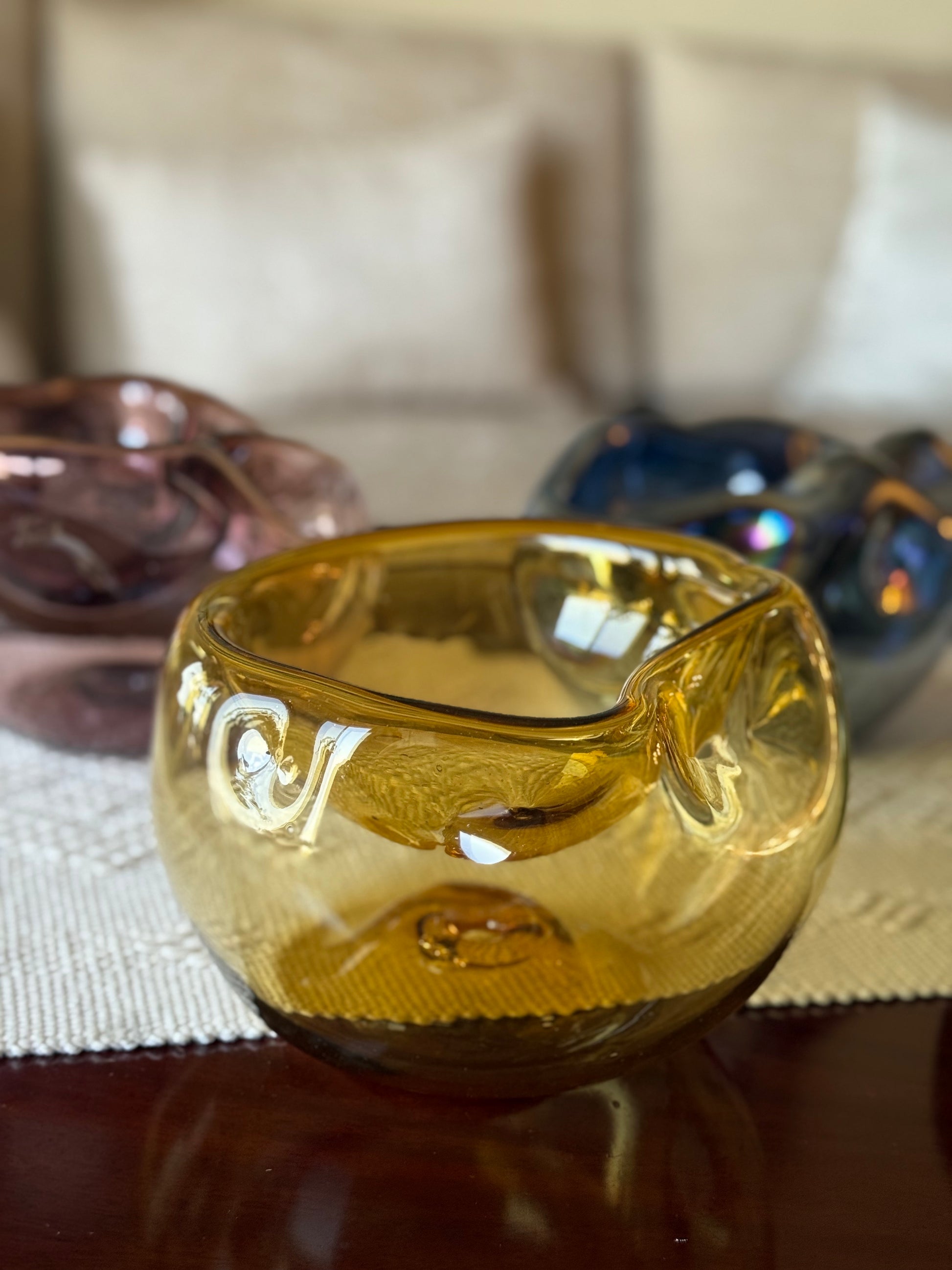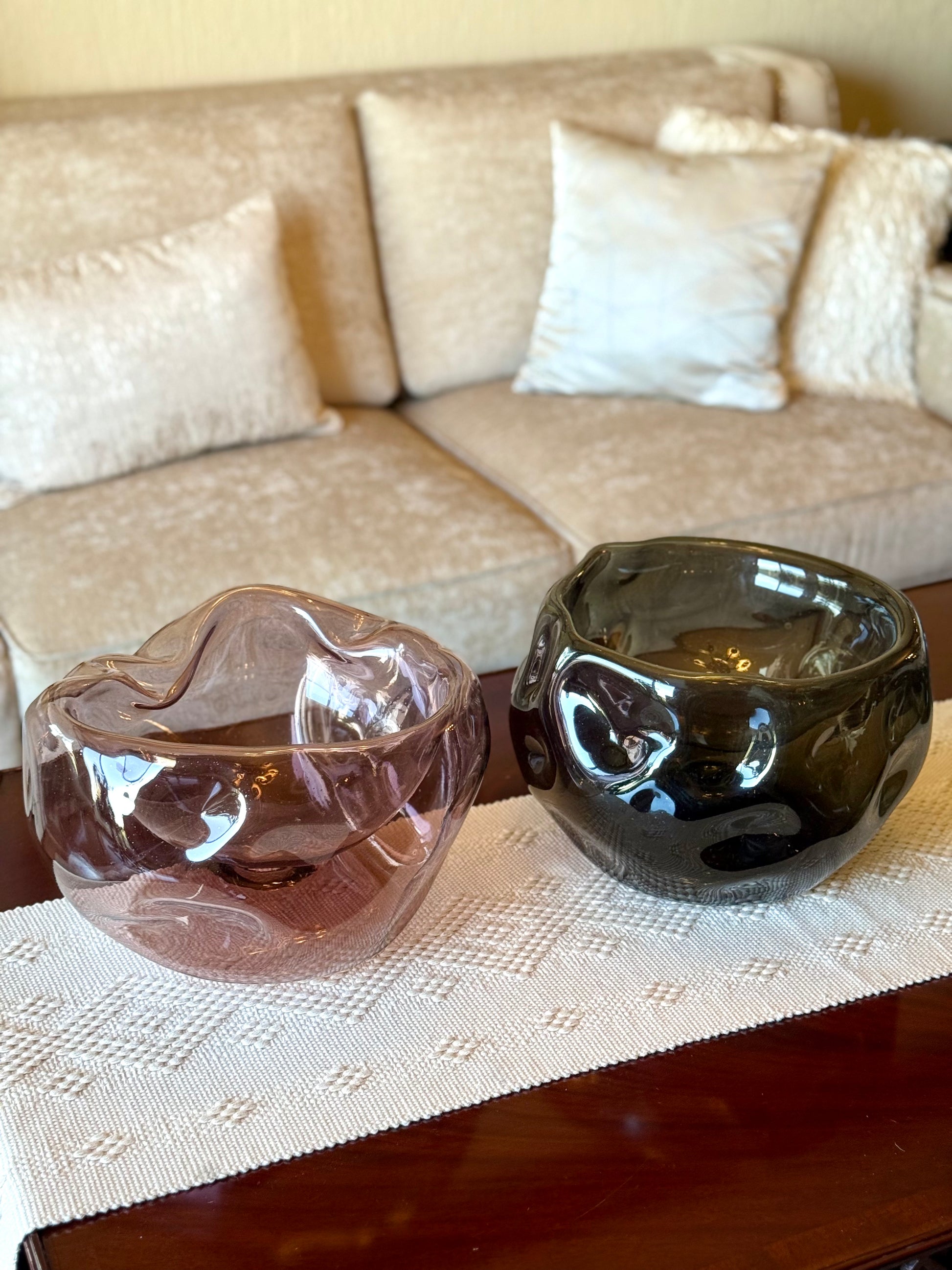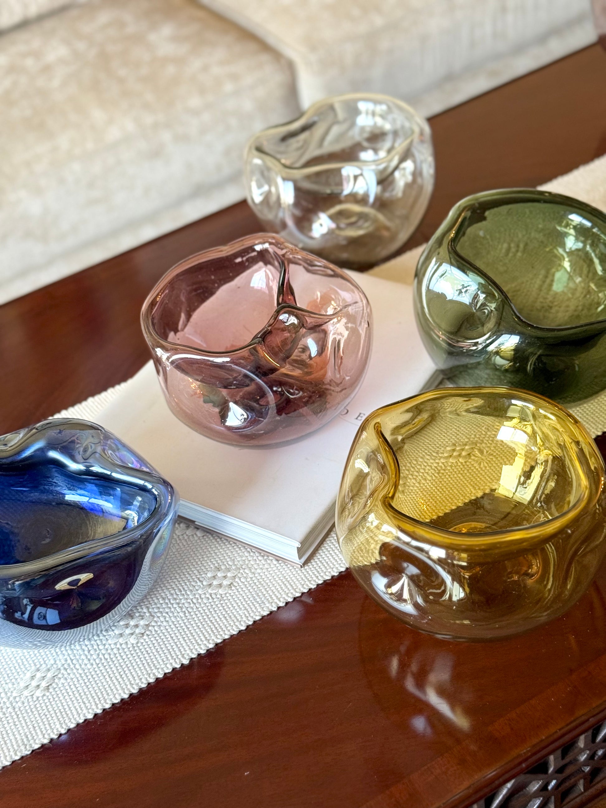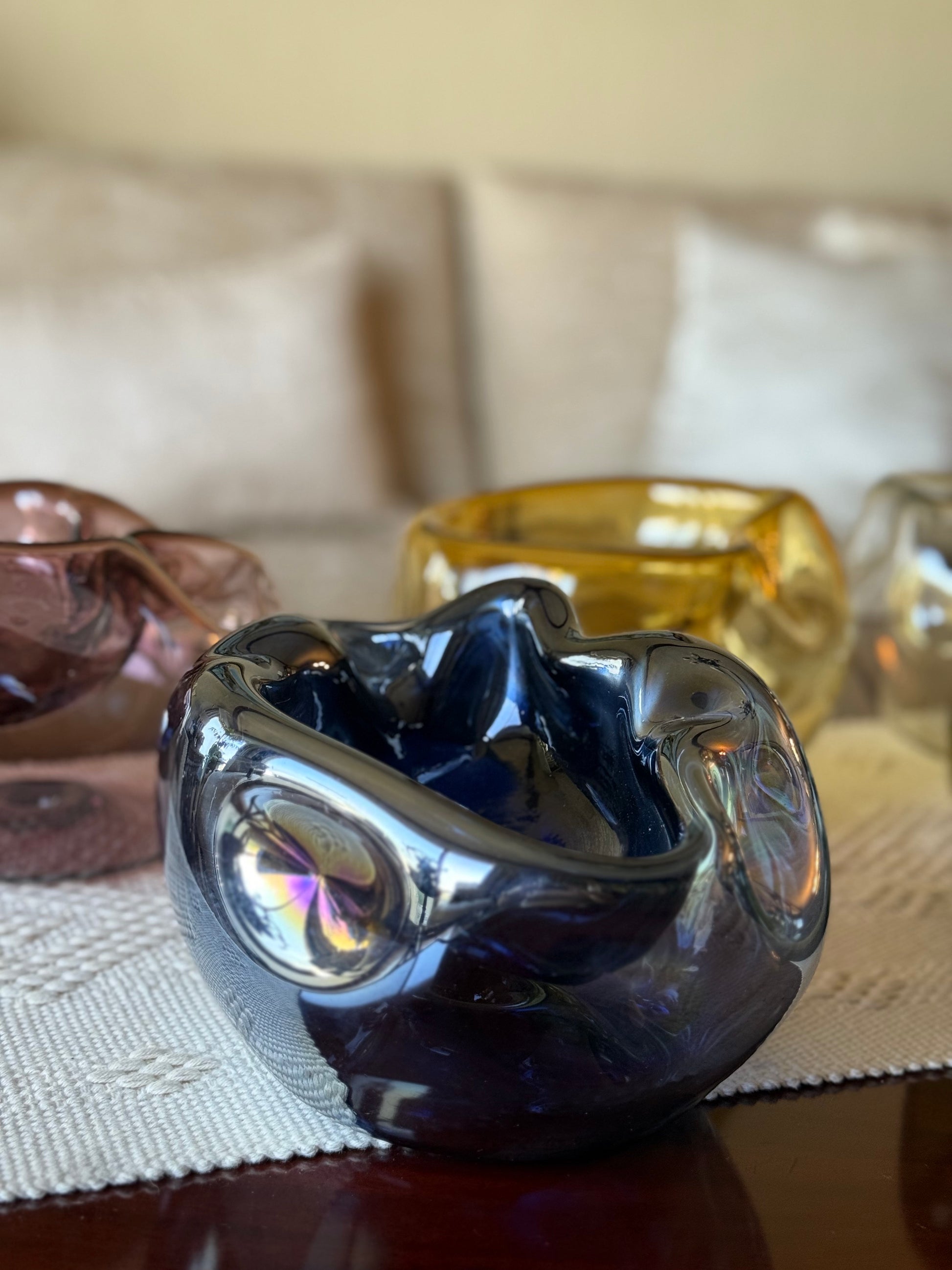 Bowl de vidrio soplado con forma asimétrica. Cada pieza tiene una forma unica y diferente.