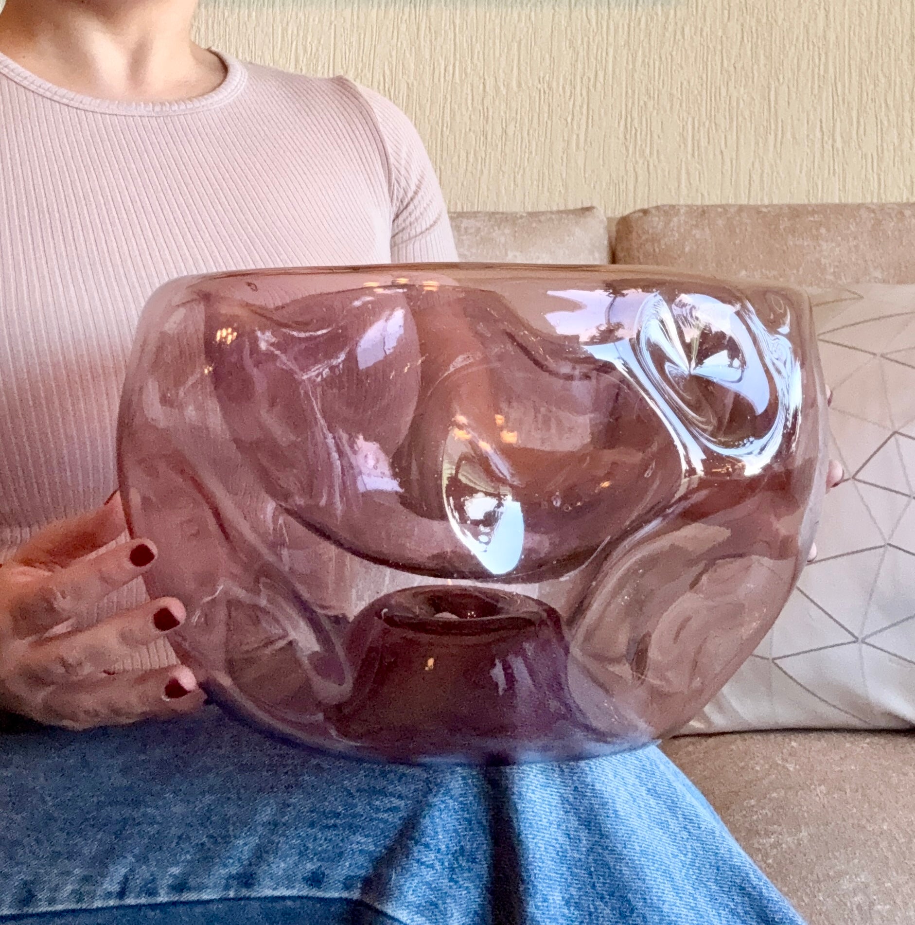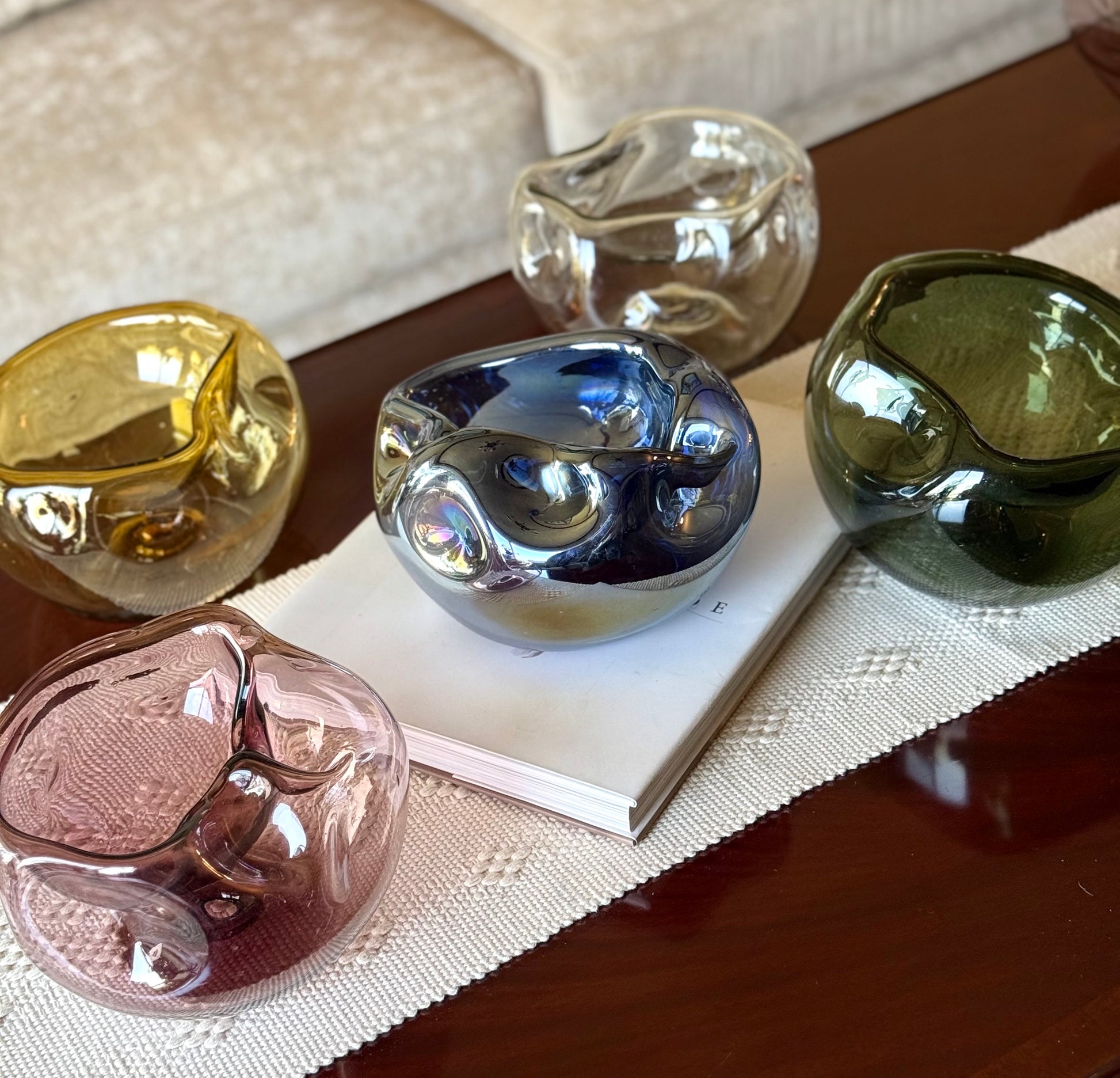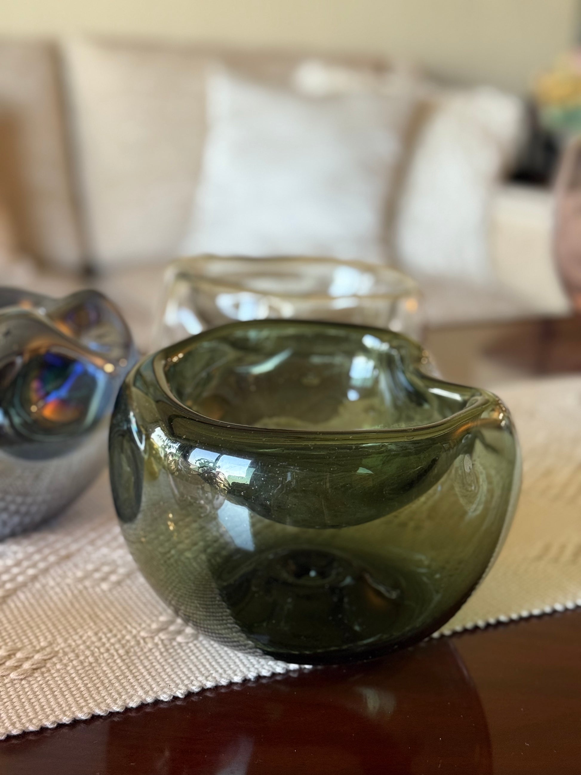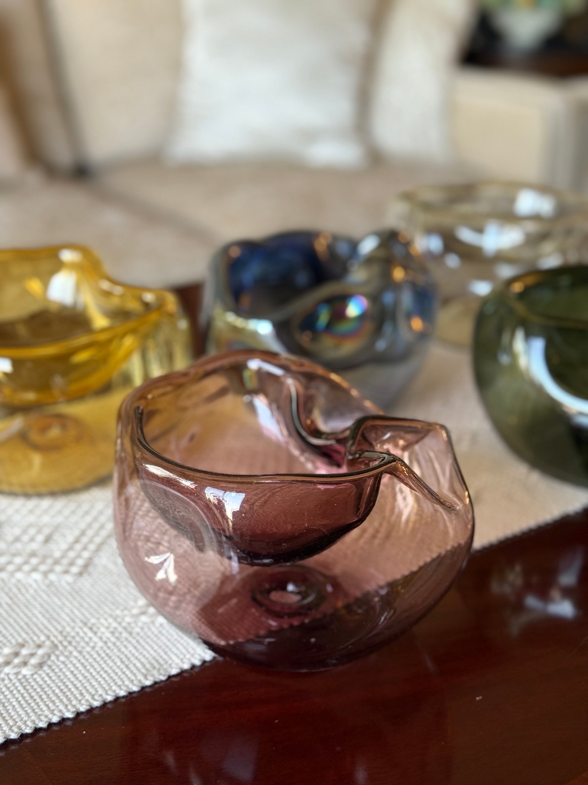 Bowl de vidrio soplado con forma asimétrica. Cada pieza tiene una forma unica y diferente.