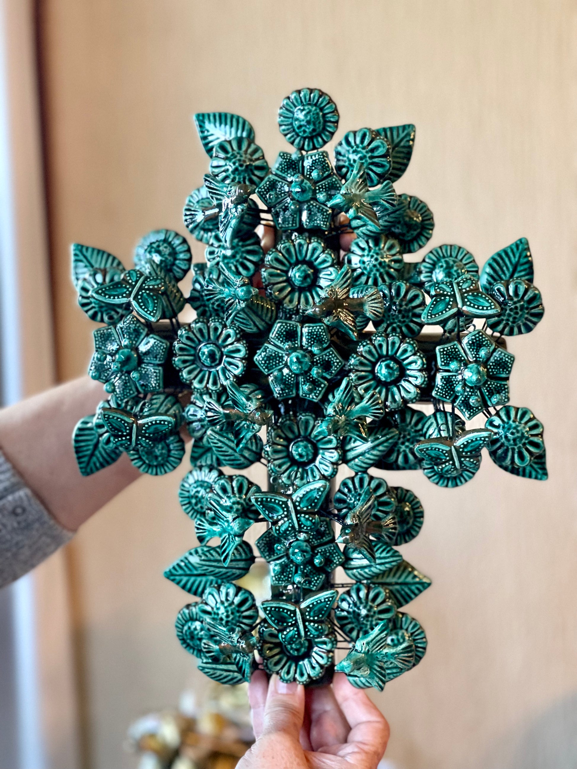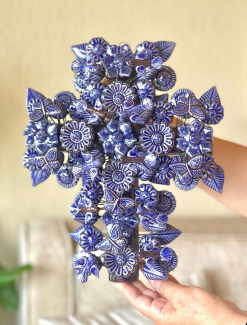 Cruz de barro vidriado para colgar en la pared o acostar sobre un libro.
