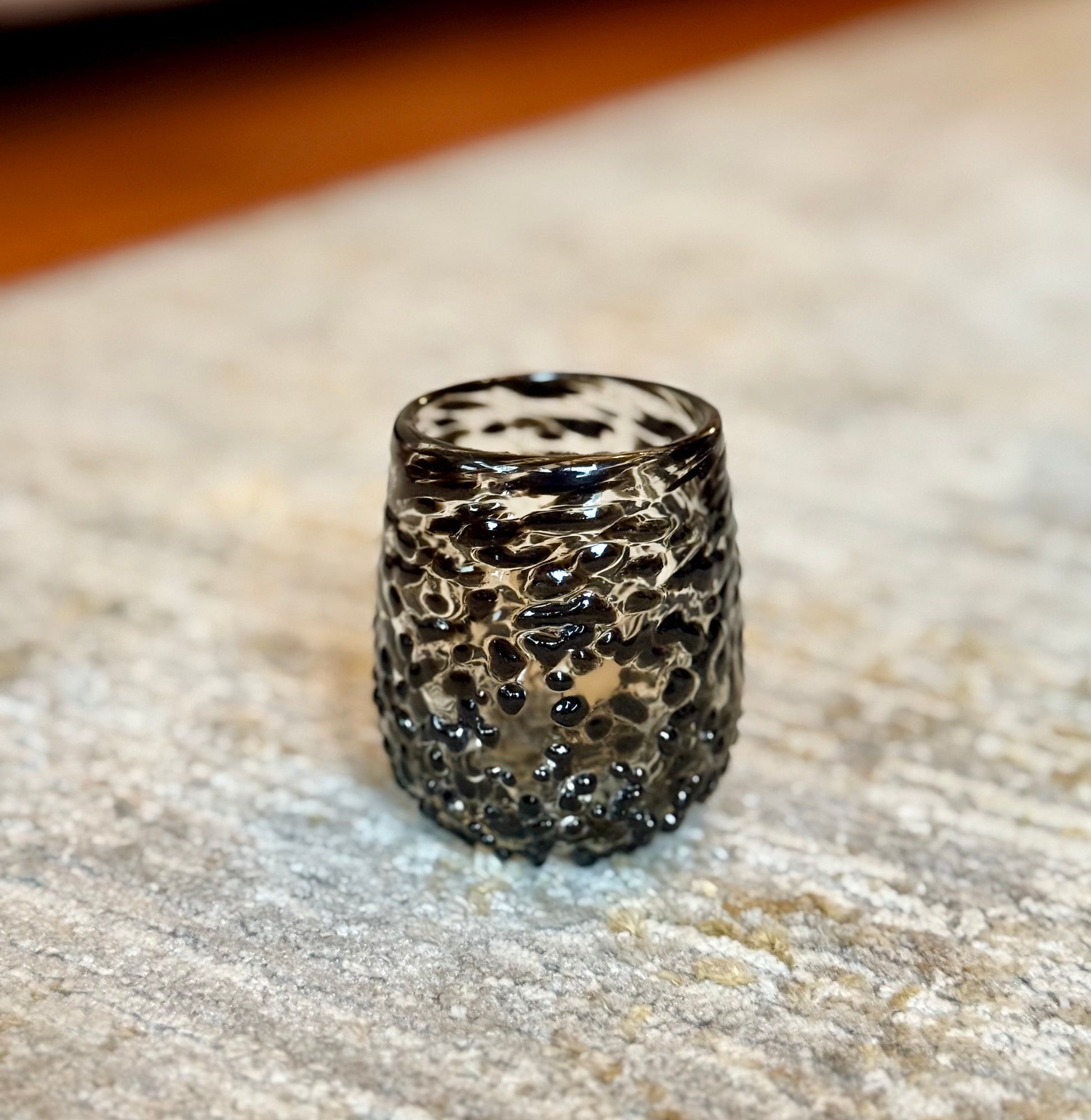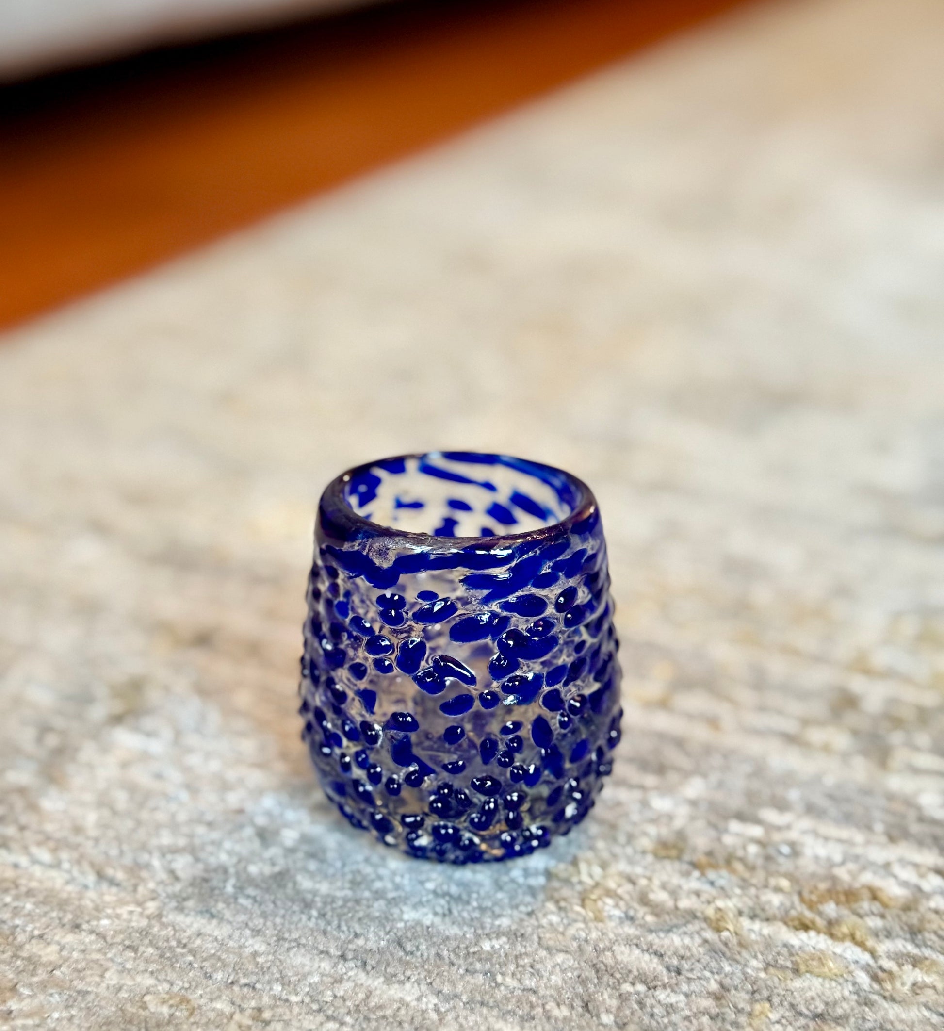 Mezcaleros de vidrio soplado con acabado granizado.
