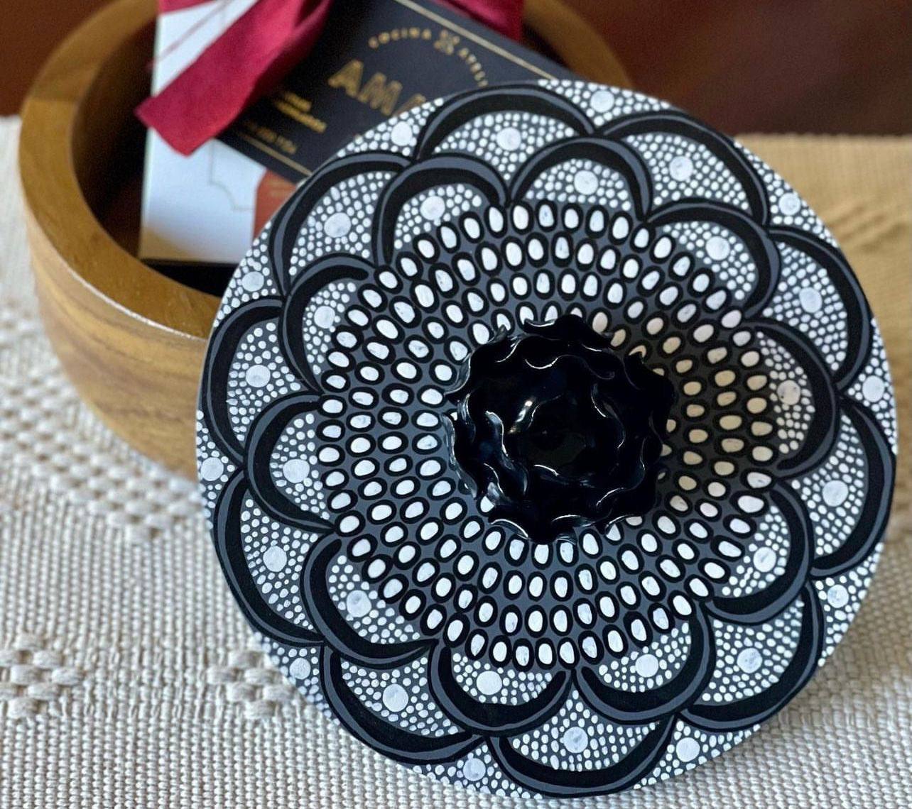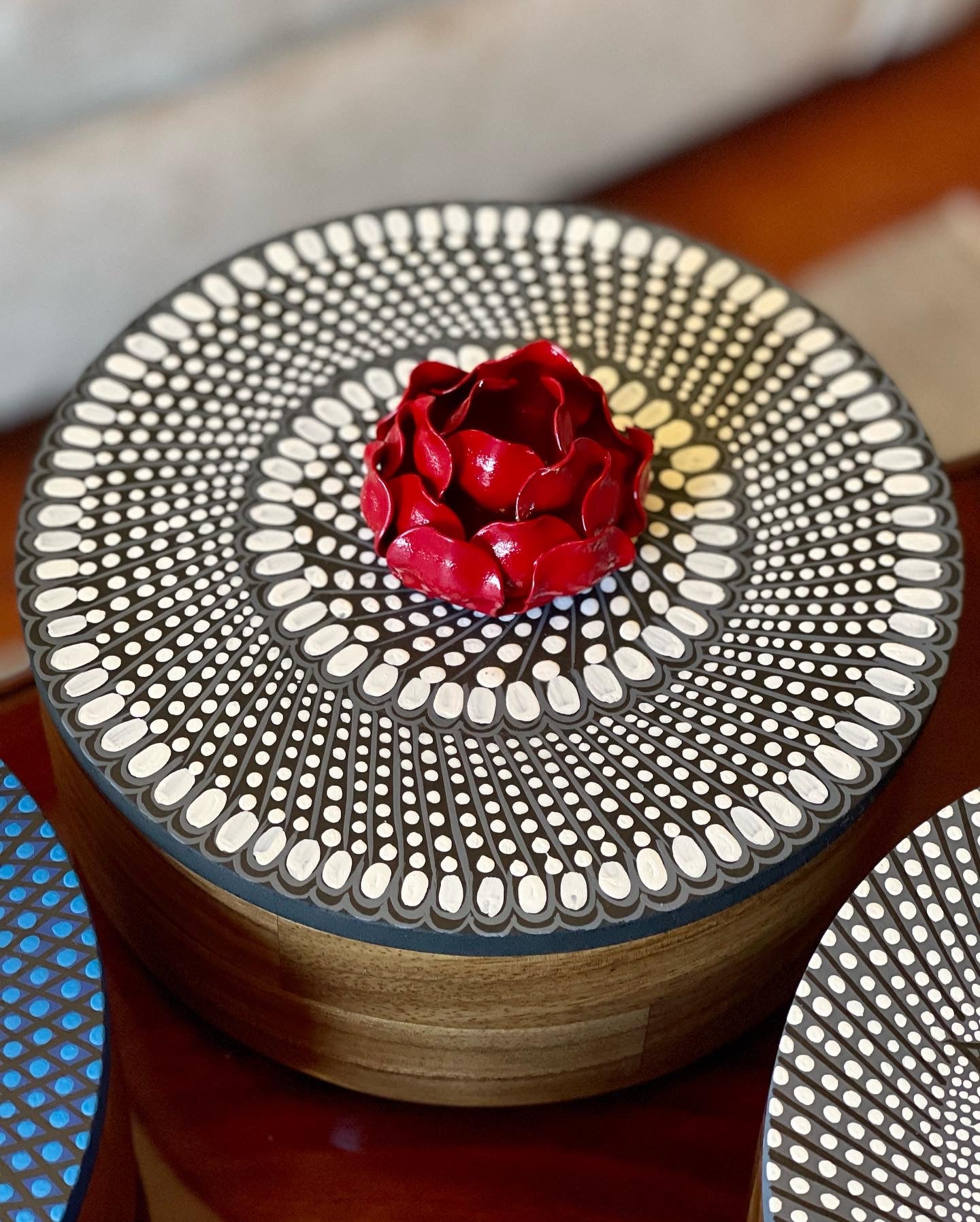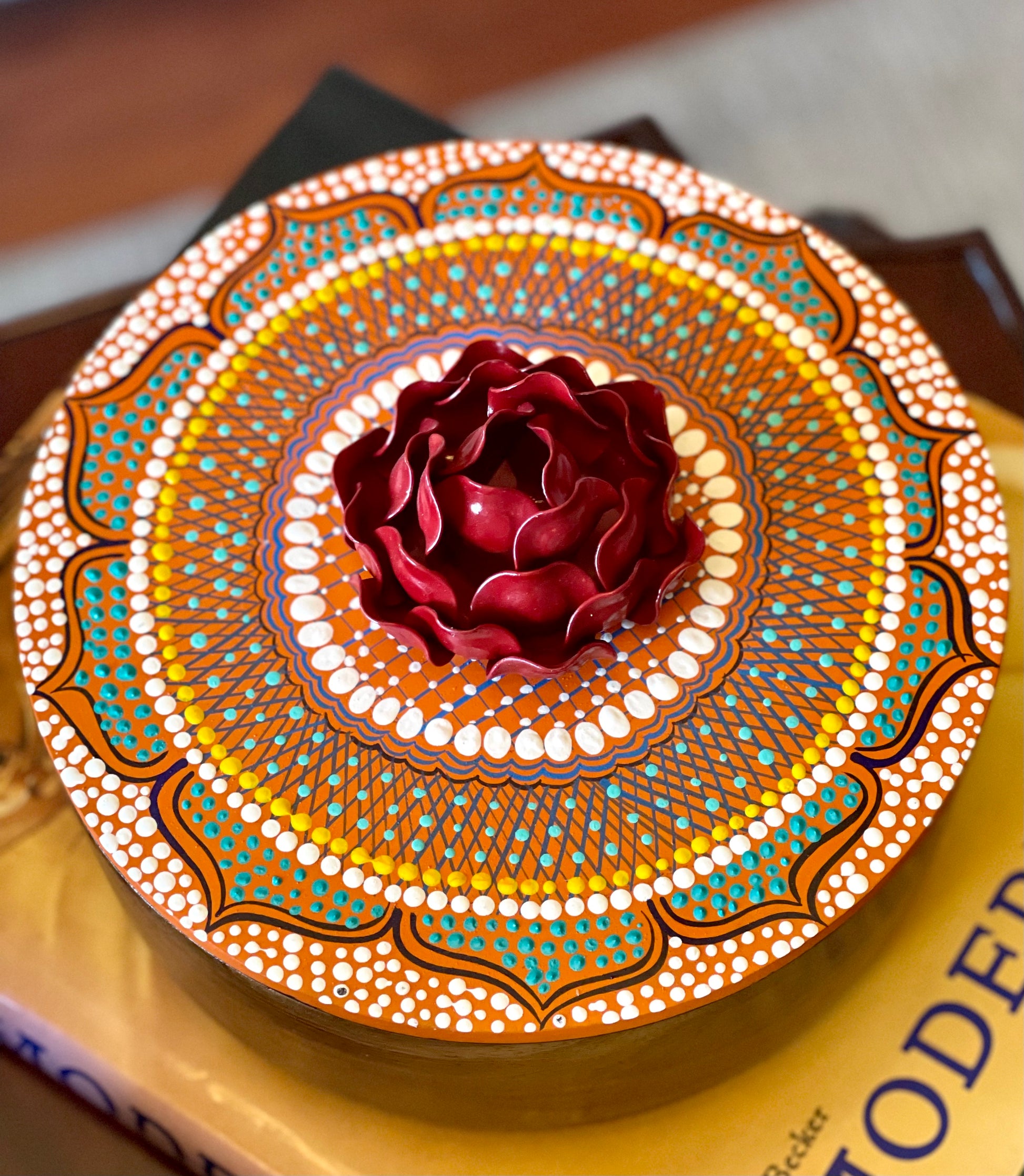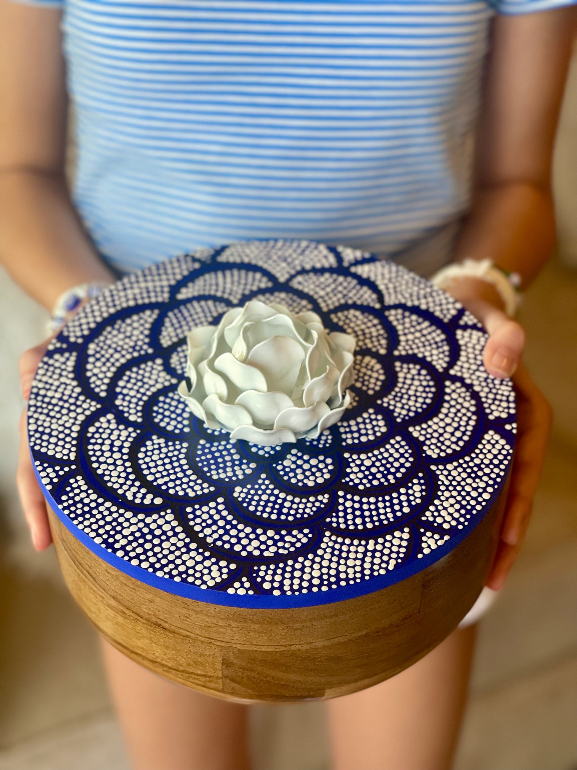 Hecho de madera de parota y su tapa pintada a mano con agarradera de flor de metal.