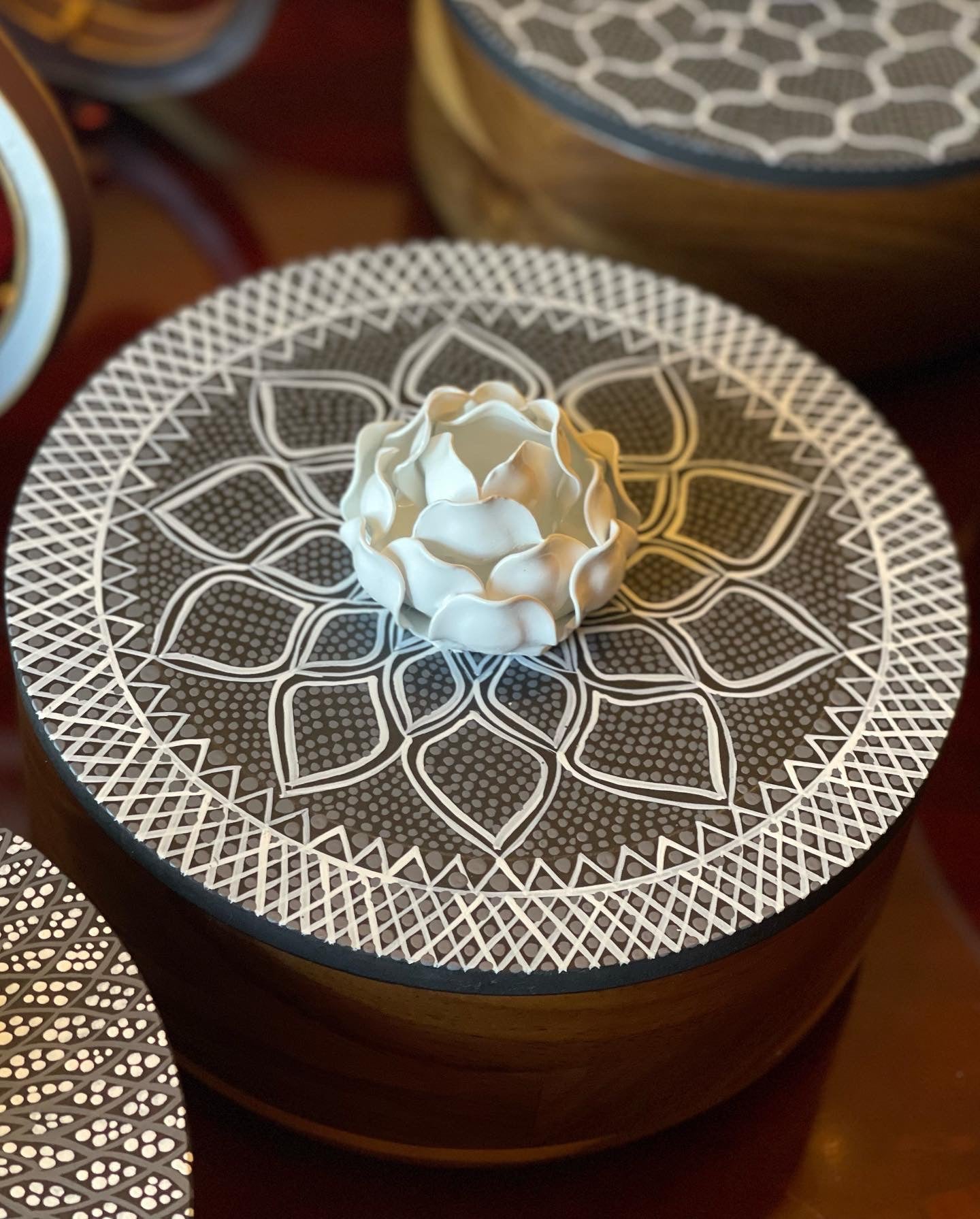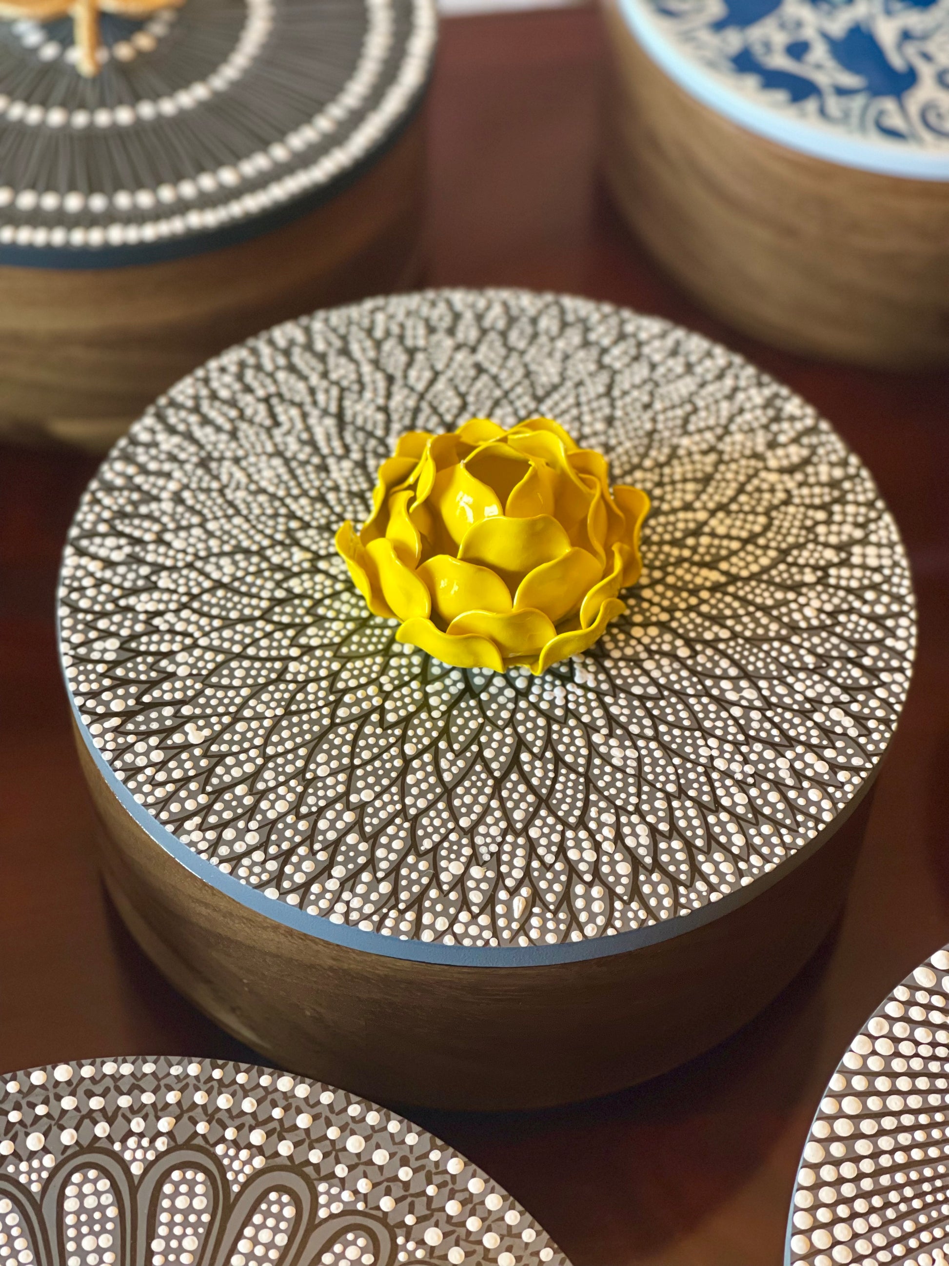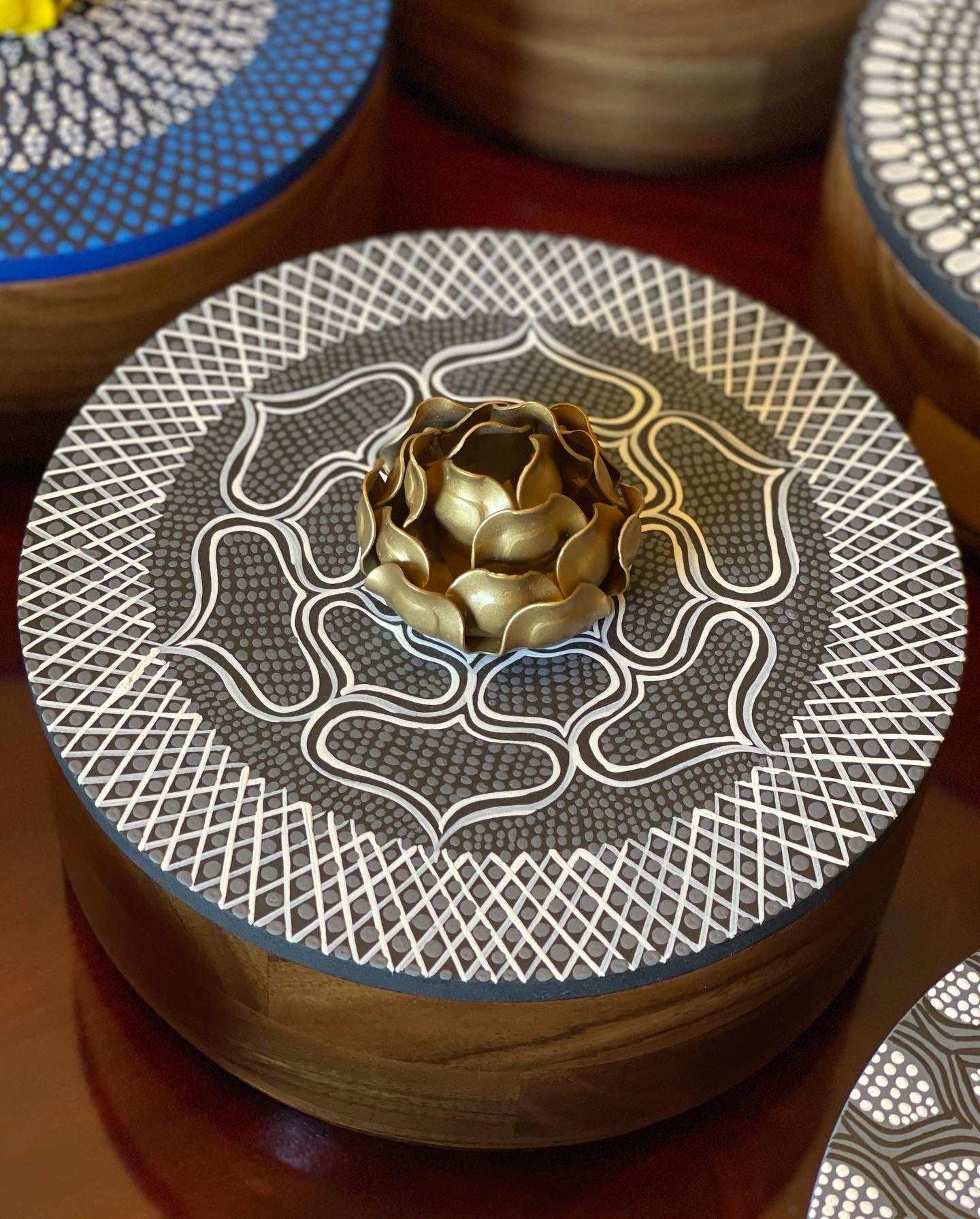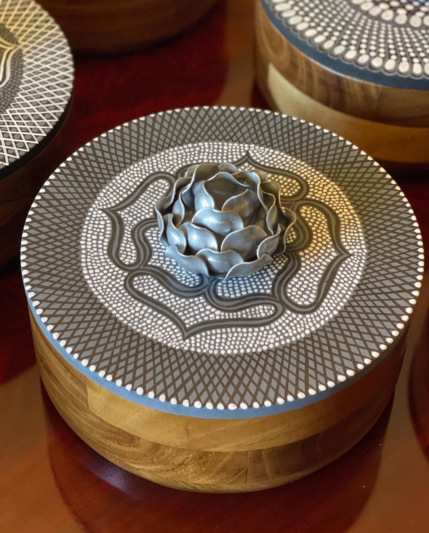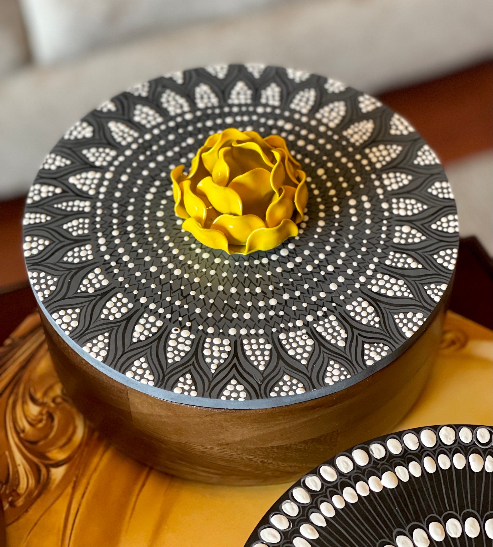 Hecho de madera de parota y su tapa pintada a mano con agarradera de flor de metal.